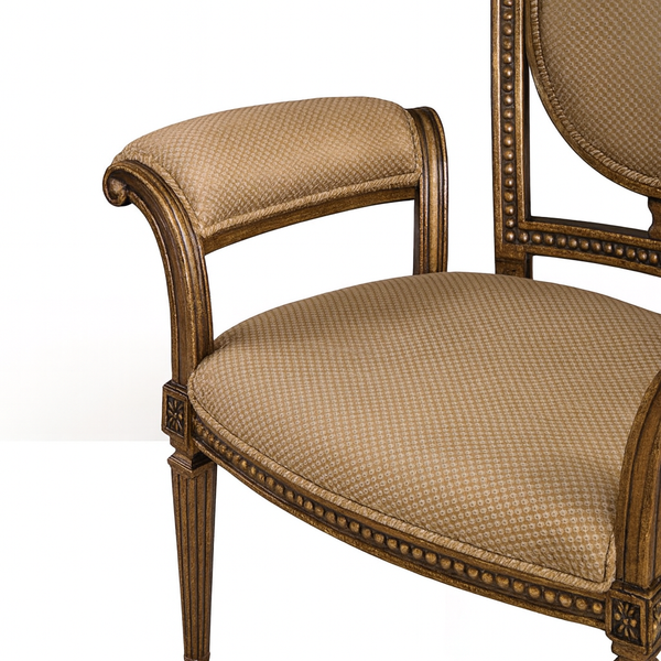 Chiếc ghế Louis Medallion Armchair mang đậm phong cách Tân cổ điển Pháp, nổi bật với phần tựa lưng hình oval duyên dáng, được bao viền chạm khắc tinh xảo. Tay vịn bọc nệm êm ái, liền mạch với khung gỗ chắc chắn, tạo cảm giác thoải mái và nâng đỡ hoàn hảo cho người ngồi.