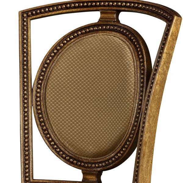 Bề mặt ghế được bọc vải cao cấp màu ánh đồng sang trọng, vừa mềm mại khi chạm vào vừa bền bỉ theo thời gian. Chân ghế thon dài, được tiện rãnh thanh lịch, kết hợp cùng lớp hoàn thiện giả cổ tinh tế, mang lại vẻ đẹp vượt thời gian.