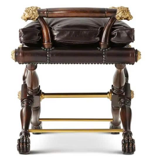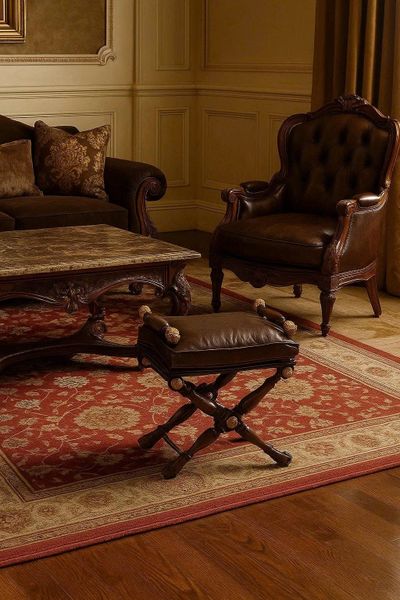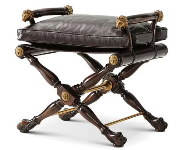 Chiếc ghế đôn cổ điển mang phong cách hoàng gia với thiết kế khung gỗ chữ X độc đáo, điểm xuyết hoa văn vàng đồng sang trọng, tạo nên vẻ quý phái và đẳng cấp cho không gian nội thất.