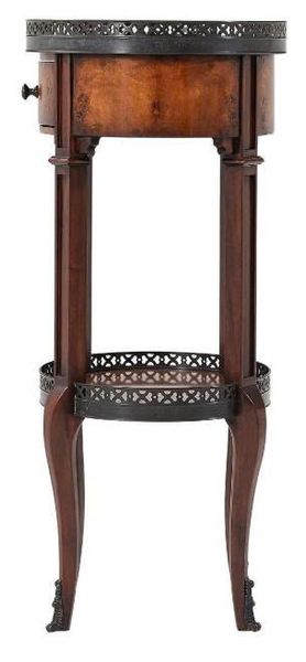 Chiếc bàn trong hình là bàn gỗ tròn cổ điển với thiết kế thanh thoát, mang hơi hướng châu Âu thế kỷ XVIII – XIX. Bàn được chế tác từ gỗ tự nhiên, bề mặt vân gỗ rõ nét, phủ màu nâu cánh gián sang trọng. Phần viền trên và dưới bàn được bo tròn, trang trí thêm nẹp kim loại chạm hoa văn cổ điển tinh xảo, tạo điểm nhấn sang trọng.