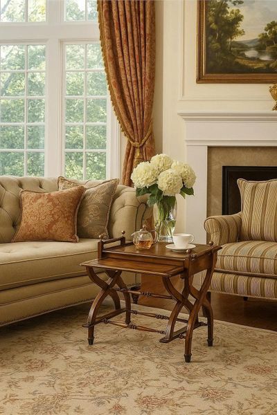 Mặt bàn vuông vắn, viền gỗ được bo nhẹ, đi kèm chi tiết tay vịn nhỏ hai bên giúp tăng thêm vẻ duyên dáng. Đây là mẫu bàn xếp lồng có thể sử dụng linh hoạt: làm bàn trà, bàn trang trí hoặc bàn phụ trong phòng khách, phòng làm việc, hoặc các không gian mang phong cách cổ điển – vintage.