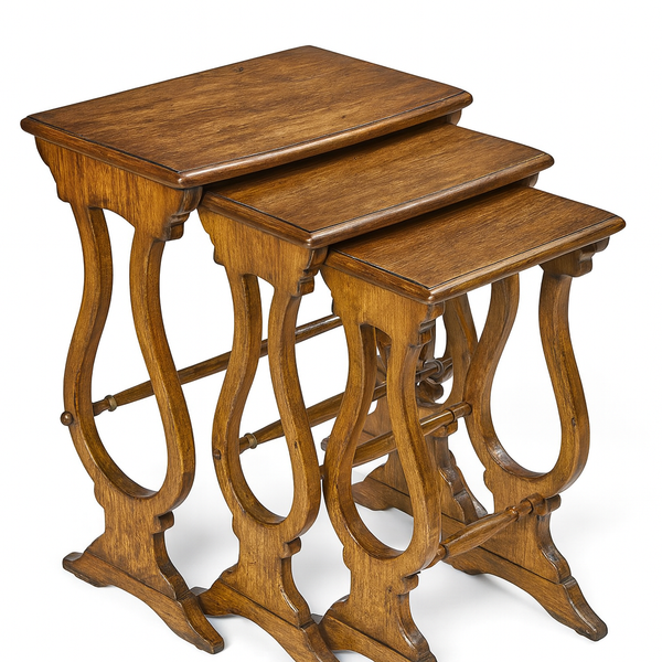 Bộ bàn gỗ xếp lồng 3 chiếc với thiết kế tinh tế, mang đậm phong cách cổ điển châu Âu. Mỗi bàn có thể xếp gọn vào nhau, vừa tiết kiệm không gian vừa tiện lợi khi sử dụng.