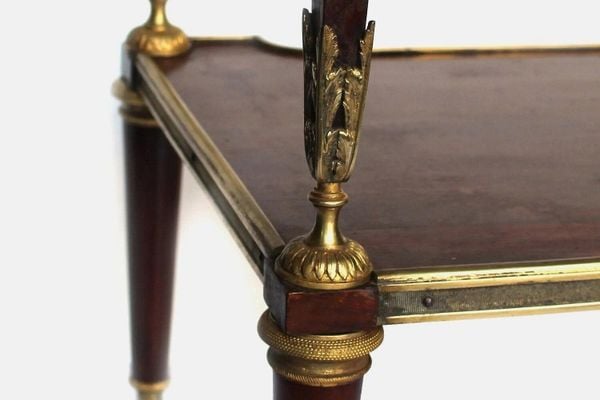 Các chi tiết hoa văn và đầu chân bàn được chạm trổ và trang trí kim loại mạ đồng tinh xảo.