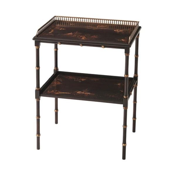 Chiếc bàn gỗ 2 tầng này mang phong cách cổ điển châu Âu, nổi bật với chi tiết viền đồng quanh mặt bàn trên, tạo điểm nhấn sang trọng và tinh tế. Thiết kế thanh thoát, gọn gàng, nhưng vẫn bộc lộ sự chắc chắn và tinh xảo trong từng chi tiết.