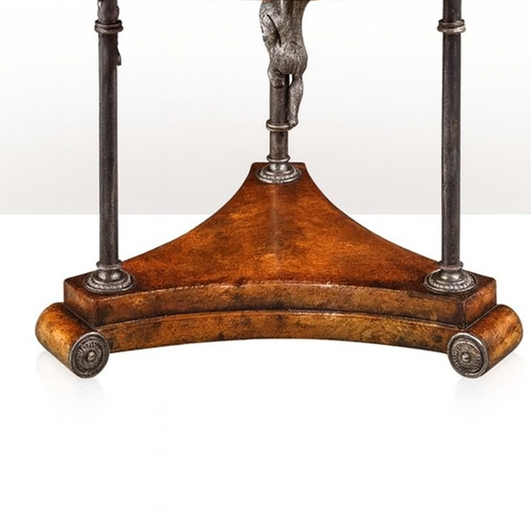 Điểm nhấn nổi bật chính là phần chân bàn được thiết kế đặc biệt với 3 tượng khỉ kim loại tinh xảo đang leo trụ, vừa mang tính nghệ thuật, vừa gợi sự vui nhộn và phá cách. Phần đế tam giác vững chắc, đảm bảo độ cân bằng và bền bỉ cho sản phẩm.