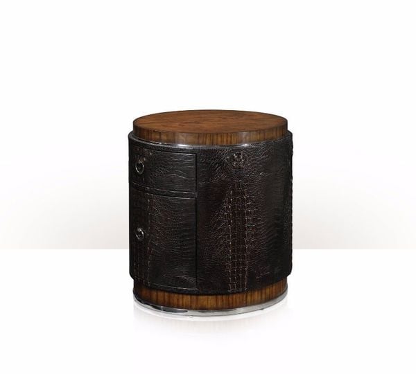 Chiếc bàn phụ mang phong cách sang trọng và độc đáo, được thiết kế theo hình trụ tròn lạ mắt. Mặt bàn làm từ gỗ ash với vân gỗ rõ ràng, tạo cảm giác ấm áp và sang trọng. Phần thân được bọc da họa tiết da cá sấu cao cấp, mang đến vẻ đẹp quyền lực, cá tính nhưng vẫn tinh tế.
