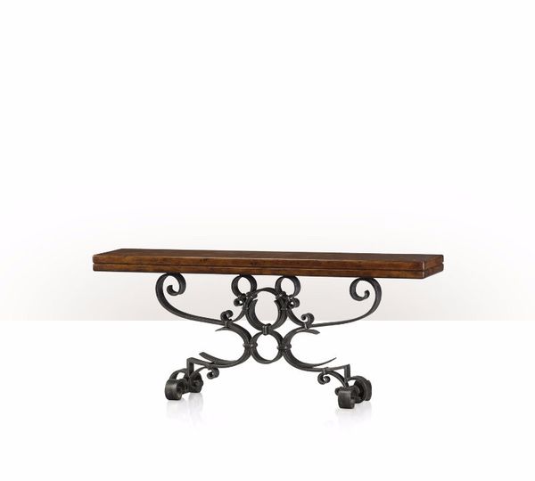 A wrought iron console table, the rectangular antiqued wood top above a scroll base.