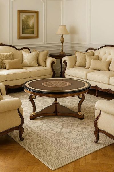 Chiếc bàn trà tròn mang phong cách cổ điển châu Âu này là tuyệt phẩm kết hợp giữa nghệ thuật chế tác và đẳng cấp nội thất.