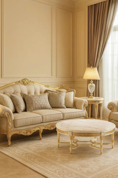 Chiếc bàn trà này là hiện thân của sự lộng lẫy và tinh xảo. Mặt đá marble tự nhiên với vân mây thanh thoát mang đến cảm giác trang nhã, sang trọng. Phần khung bàn được chế tác từ gỗ tự nhiên sơn trắng ngà, chạm nổi hoa văn Baroque mạ vàng óng ánh – tạo nên vẻ đẹp quý tộc đầy mê hoặc.