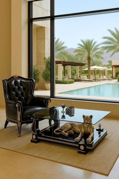 Độc đáo và quyền lực, bàn trà nghệ thuật tượng sư tử là điểm nhấn cho không gian sống mang đậm dấu ấn cá nhân. Thiết kế với tượng sư tử nằm uy nghi ở phần đế, kết hợp mặt bàn kính cường lực cao cấp tạo nên vẻ đẹp mạnh mẽ, đầy kiêu hãnh. Các chi tiết mạ ánh kim và phào chỉ đen – vàng tạo nên tổng thể sang trọng, tinh tế.