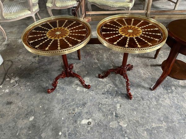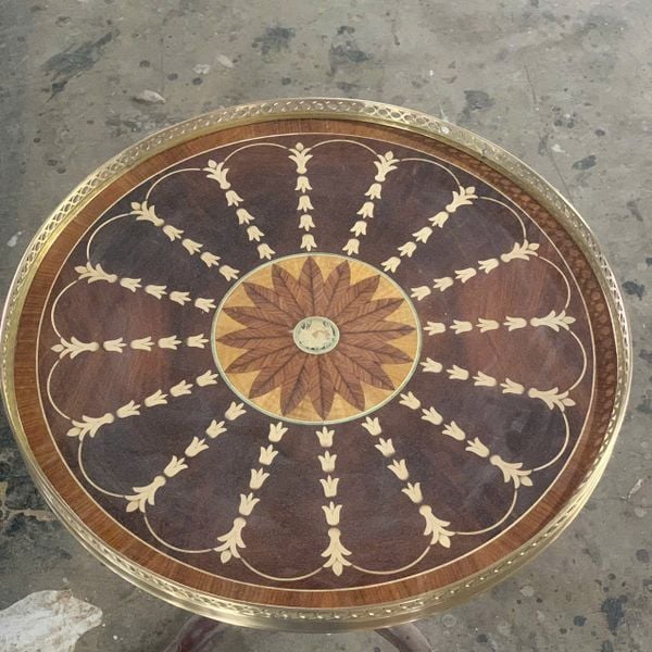 Đây là chiếc bàn tròn nhỏ (gueridon/occasional table) phong cách cổ điển có viền ốp đồng thau (gallery rail) - thiết kế rất phổ biến trong nội thất phong cách cổ điển châu Âu. Công năng chính của nó thường bao gồm: