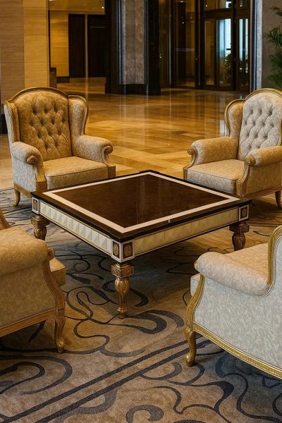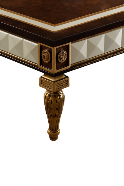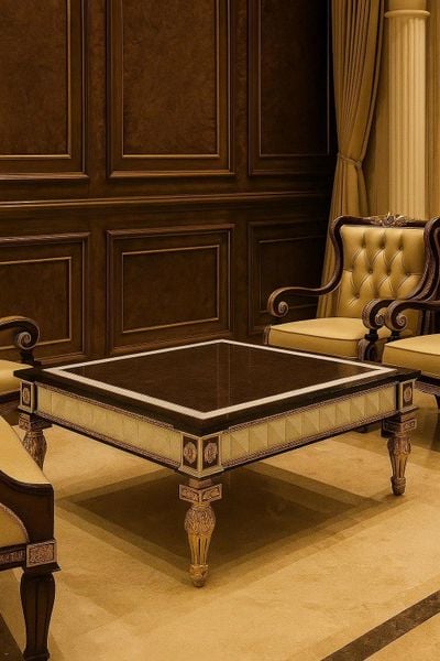 Mang vẻ đẹp đậm chất hoàng gia, bàn trà vuông cổ điển gây ấn tượng với mặt bàn veneer nâu vân gỗ sang trọng, viền chỉ nổi ánh đồng và khung thân chạm khắc kim tự tháp 3D hiện đại. Bốn chân bàn tiện thủ công, mạ vàng ánh kim, tạo điểm nhấn quý tộc cho không gian tiếp khách.