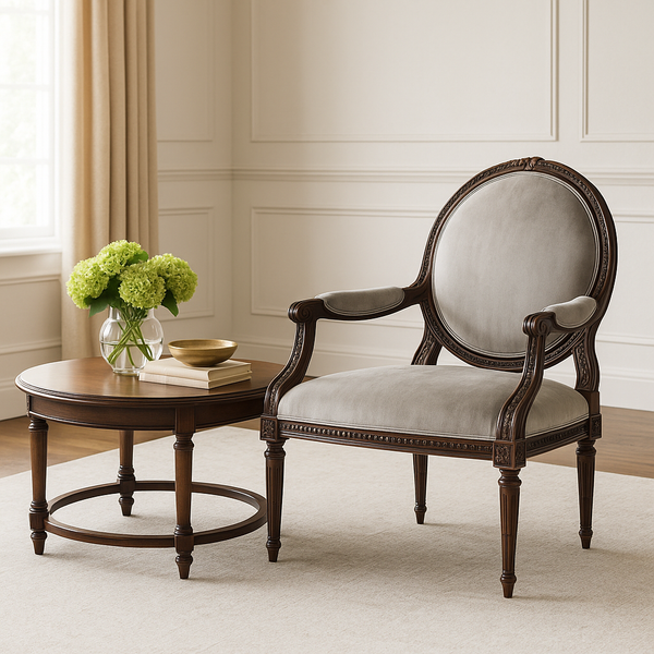 Chân ghế dạng trụ khía rãnh (fluted legs) – đặc trưng của Louis XVI: thanh tao, quý phái nhưng rất chắc chắn.